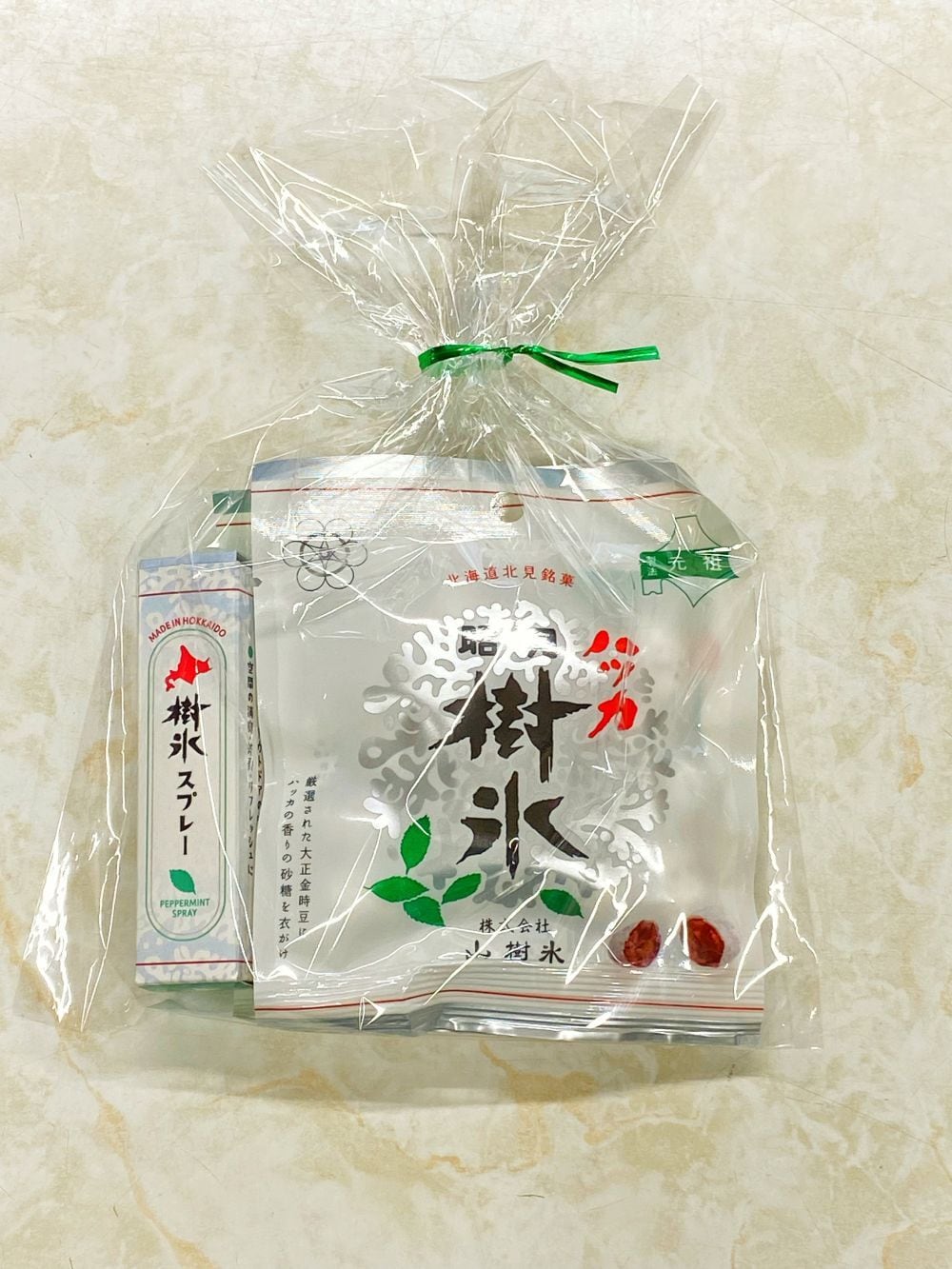 北海道産の大正金時豆を使った爽やかな甘納豆『ハッカ樹氷』と、一吹きで気分リフレッシュ消臭にも虫よけにも使える天然ハッカ使用の万能ハッカスプレー『樹氷スプレー』をセットにしたプチギフトセットです。